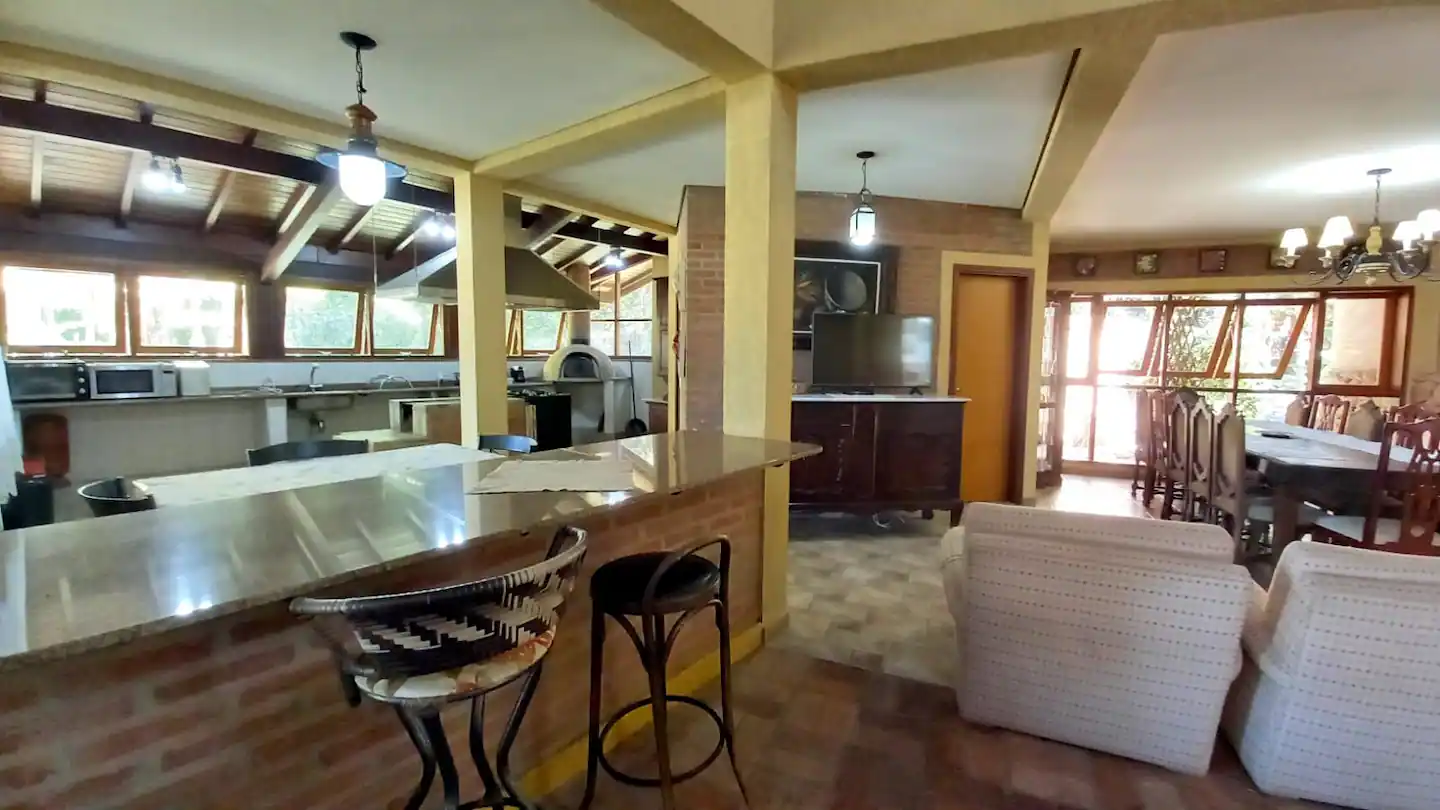 A casa possui estrutura montada para atender de 12 a 21 pessoas*, com roupa de cama e toalhas**. Forno de pizza, a lenha, churrasqueira, pratos, talheres, toalha de mesa, cozinha super equipada com todos utensílios, cafeteira e leiteira Nespresso, café de coador, boas geladeiras, copa, cozinha, sala de jantar, mesas internas e externas e capacidade de abrigar 30, 40 pessoas se for um pequeno evento, aniversário ou confraternização.